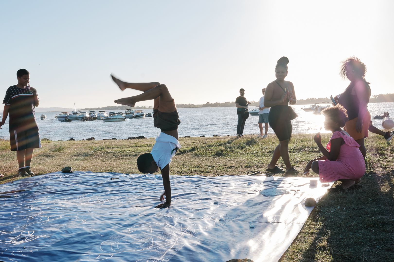 Em dado momento, um menino plantou bananeira no meio da lona e penso que essa passa a ser uma possível resposta à pergunta sobre forma do Guaíba. E, daqui, posso extrapolar para que no momento em que alguém registrava ali sua resposta, a pergunta já era respondida: a forma do Guaíba passava a ser, por alguns instantes, o movimento do braço da pessoa agachada que traça seu próprio nome. O registro que permanecia era bidimensional, mas o ato de fazê-lo, inevitavelmente passava pela tridimensionalidade do gesto do corpo, acenando aos relevos da ideia original. Meio transcendental, mas só se quiser. Se não quiser, é bem prático e direto, quase simples demais. A pergunta poderia ser qualquer outra e os nossos olhos encontrariam respostas para ela nos desenhos e nos movimentos feitos.