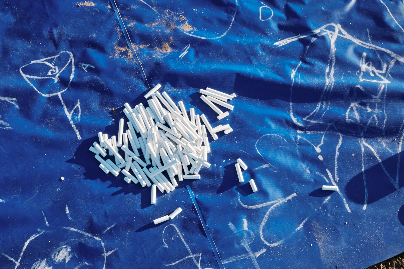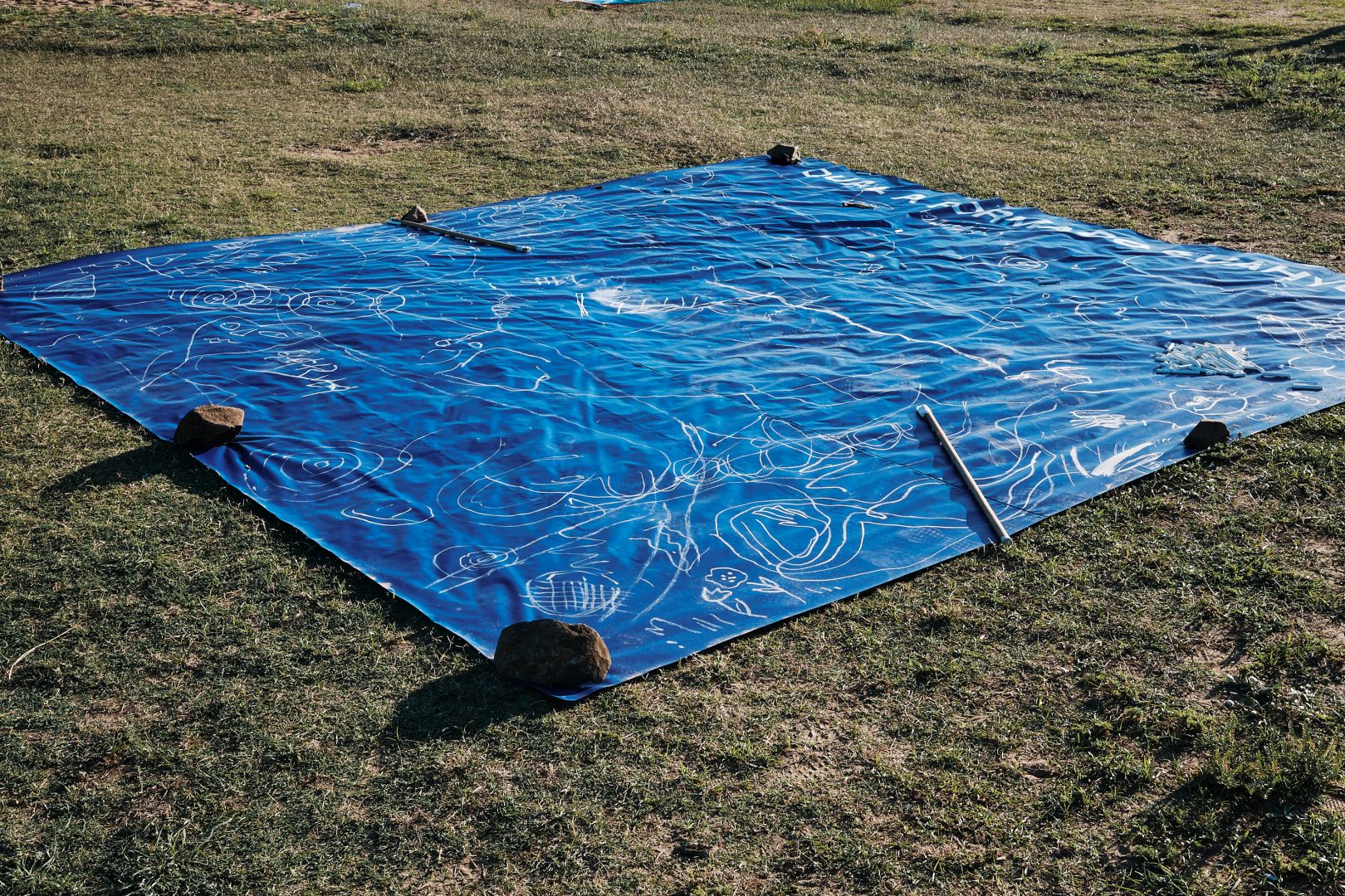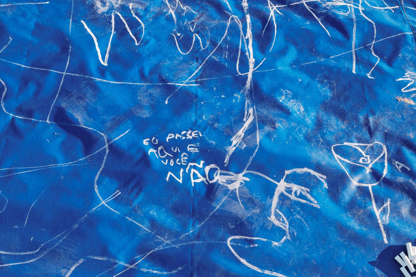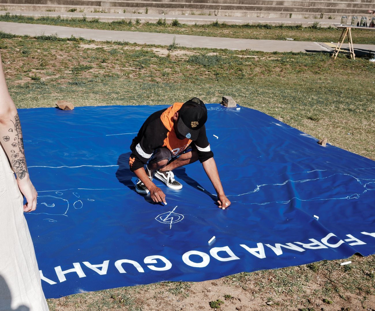 Notando essas complexidades, voltei a pensar sobre o cerne daquela proposta inicial: que o que quer que fosse realizado num espaço determinado, pudesse ser compreendido como uma resposta à pergunta Qual a forma do Guahyba?. Tendo essa operação base em mente, a solução que encontrei foi de planificar o trabalho, indo de uma escultura para um desenho colaborativo, chegando na ideia da lona com os gizes.