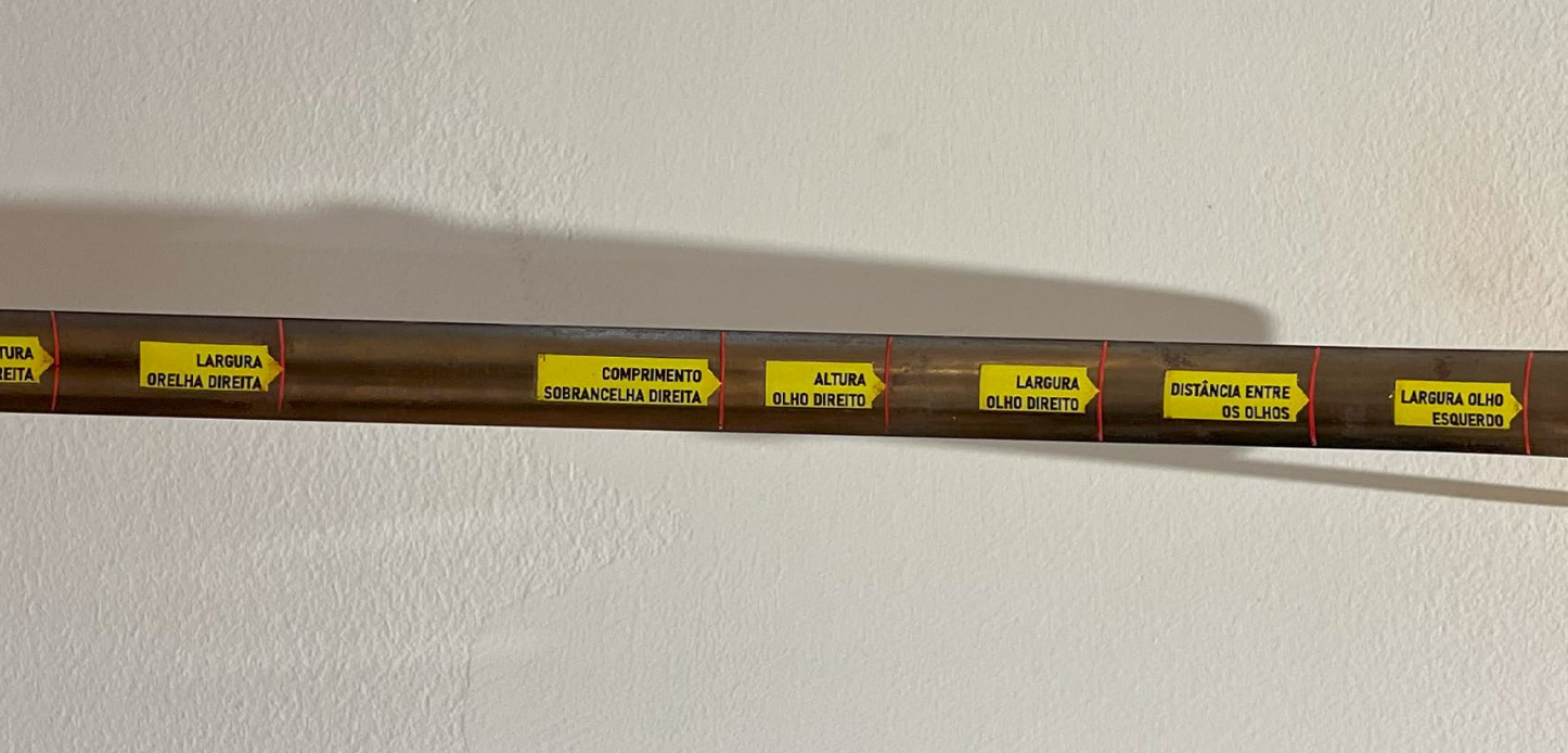 As medidas de três trenas são apagadas e substituídas pelas medidas do corpo do artista. As trenas se dividem em três volumes: cabeça e tronco; braços e mãos; pés e pernas.