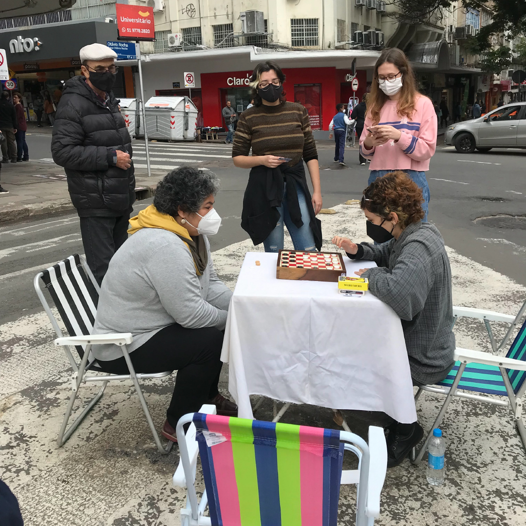 Durante a ação, os artistas, junto de convidados e de público espontâneo, preencheram o espaço com mesas, cadeiras e toalhas de picnic. Para além, diversos jogos de carta e tabuleiro ficaram a disposição do público, que podia experimentar partidas de dama, xadrez, pife, ludo e outros.