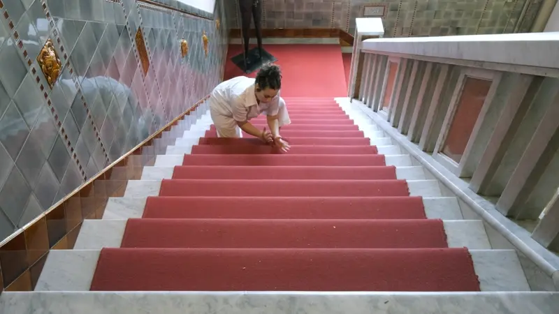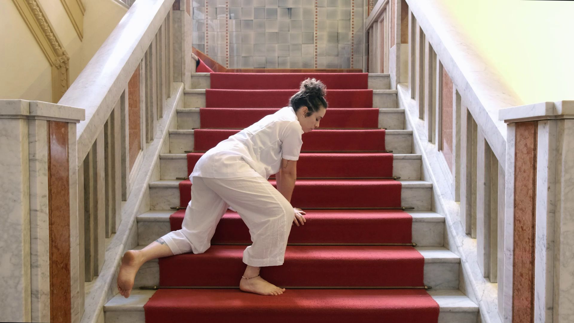 Em um trecho do texto sobre o trabalho1, Cristina Barros, curadora assistente da exposição, escreve: “O mármore das escadas, agora massageado, não só reinterpreta o espaço institucional como também atua nas fronteiras da produção artística contemporânea, ampliando os limites dos procedimentos escultóricos tradicionais. O trabalho se insere na prática artística de Tiago Gasperin, que investiga o deslocamento e a improdutividade em performances, ações participativas e instalações. Ao evidenciar o Museu como um corpo em tensão, o artista desloca a percepção de um elemento arquitetônico comum, a escada, a partir de um diálogo entre gesto e matéria.”